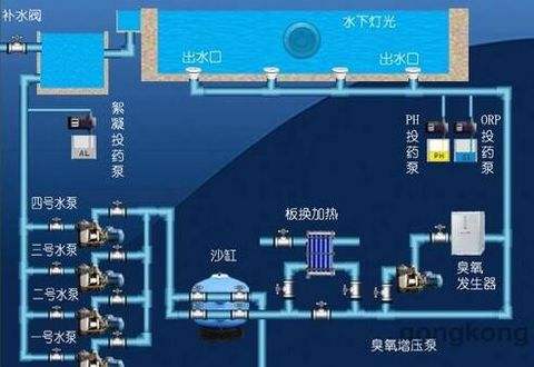 游泳池循環(huán)水系統(tǒng)包括預(yù)處埋(毛發(fā)收集器的粗濾)、絮凝處理(泵后投加混凝劑)、精過(guò)濾(過(guò)濾沙缸)、消毒及自動(dòng)PH值和ORP值調(diào)整。