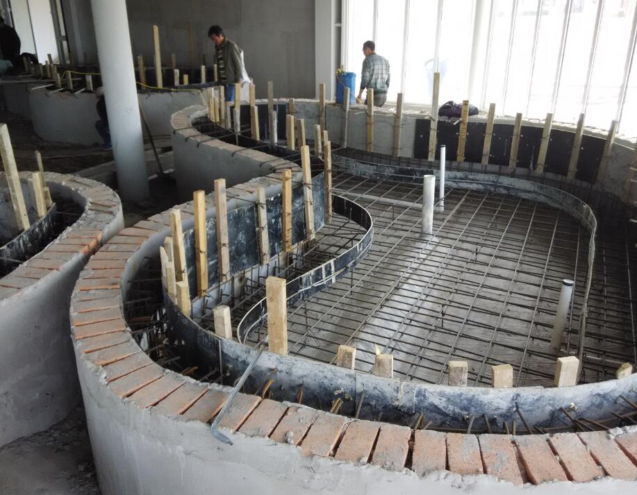 室內(nèi)溫泉區(qū)共5個(gè)泡池,平均每個(gè)泡池7m3